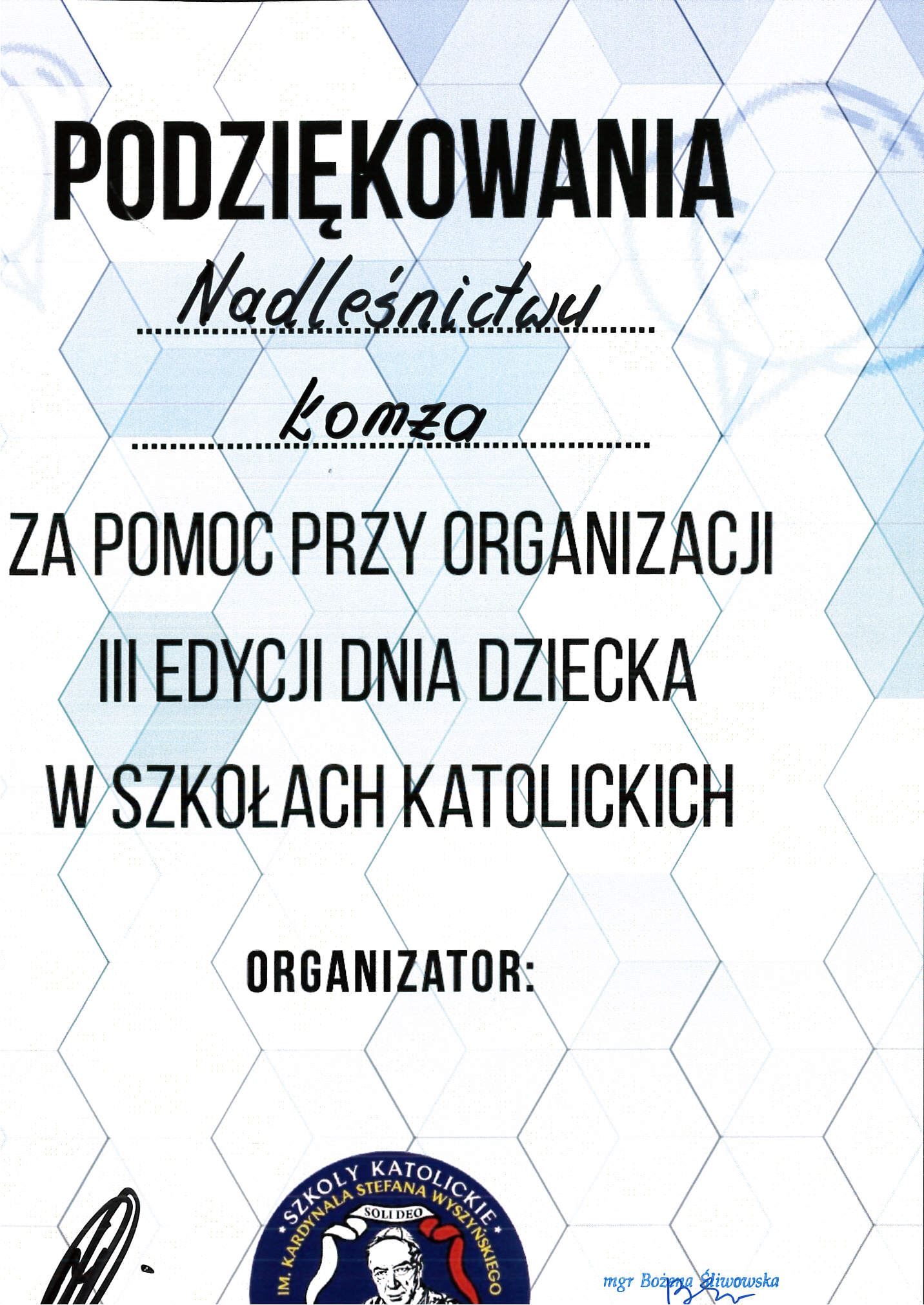 Podziękowanie ze Szkół Katolickich