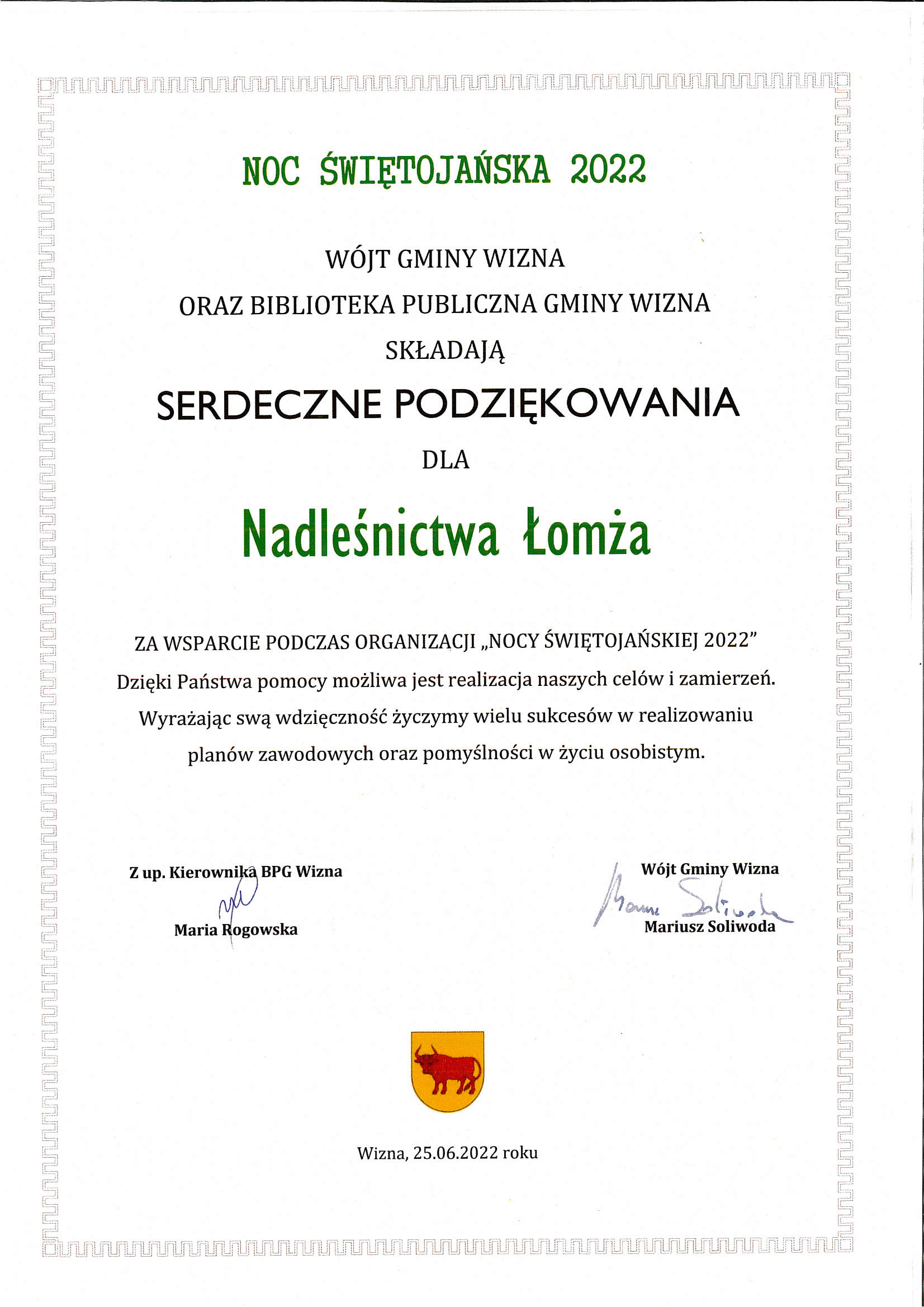Podziękowanie za udział w Nocy Świętojańskiej - Gmina Wizna